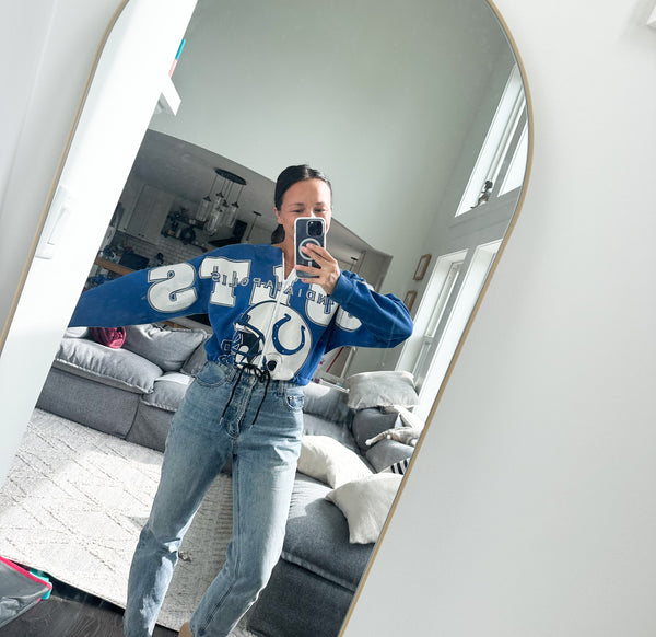 These are all ready to ship crewneck sweatshirts. They have been sourced from various places. My goal is to find vintage unique items :). With that being said these are not perfect and have some wear on them. My goal is to give these pieces new life. I hope these items have a story to them, that they were worn at a previous super bowl, or a first game, maybe at a fun tailgate and I also hope we get to wear them and make our own stories in them. :)